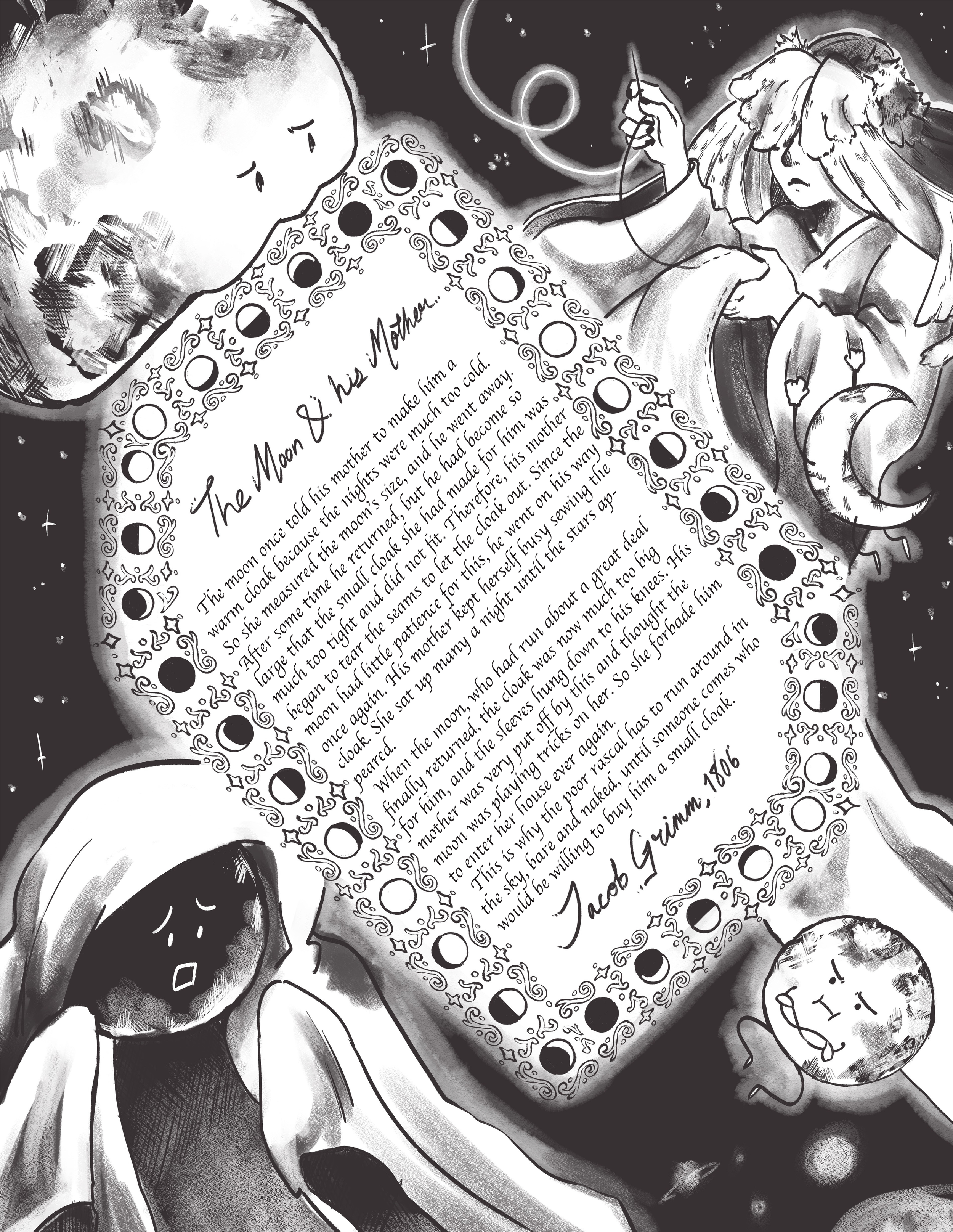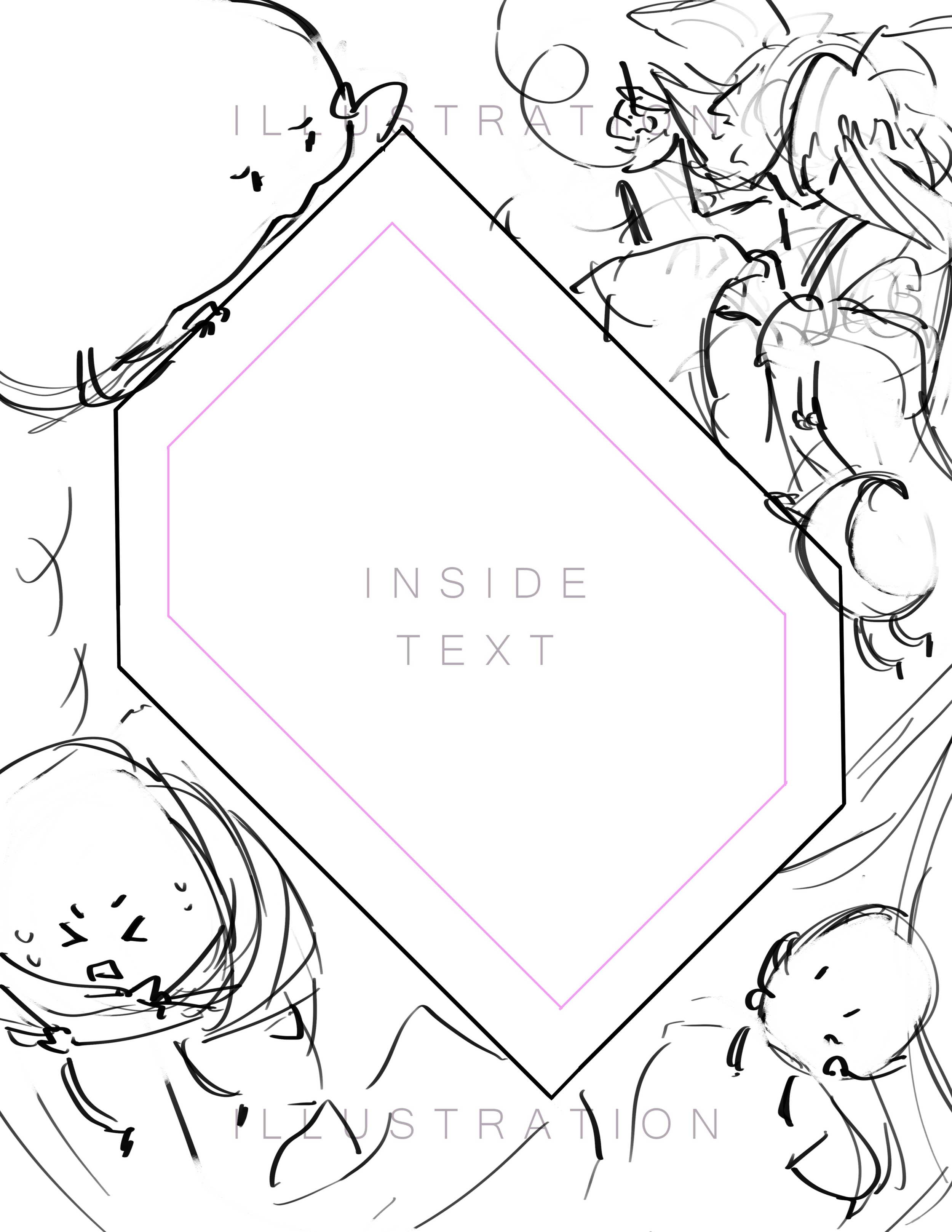 This was also the time I decided to add the story into the center. I kept it fairly simple for now, as I knew I’d have more than enough time after I finished the line work.